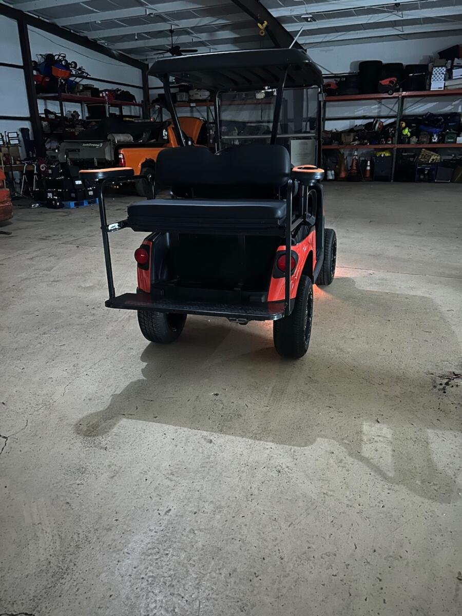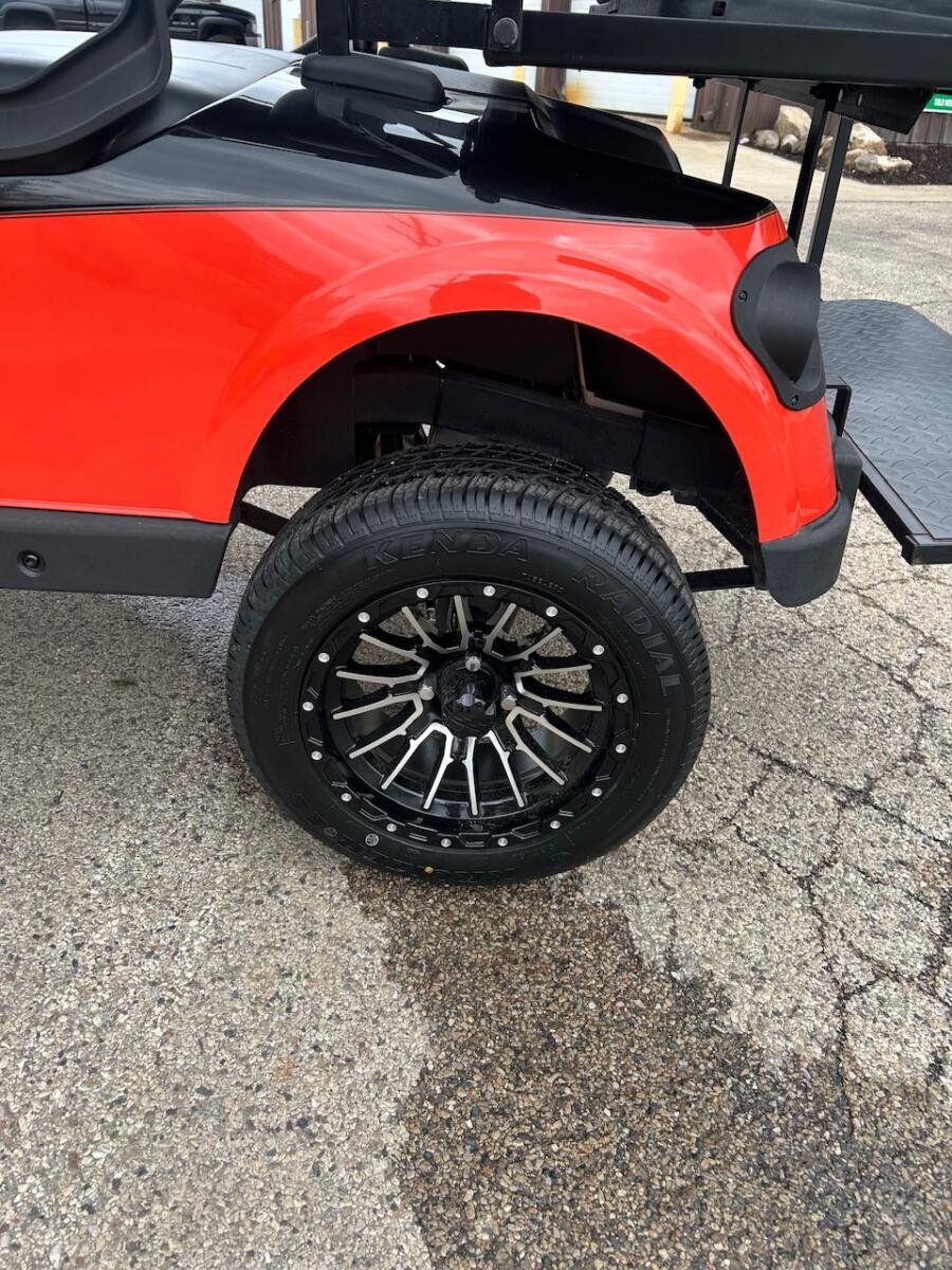 This golf cart is loaded with premium features, including a striking new body design complemented by a sleek 54-inch black roof. The six-inch lift kit not only enhances its aesthetic appeal but also provides added ground clearance for improved outdoor performance. The tinted windshield, complete with a mirror, offers both protection and style, allowing you to cruise with confidence. Comes with a wet sounds soundbar and offroad wheels